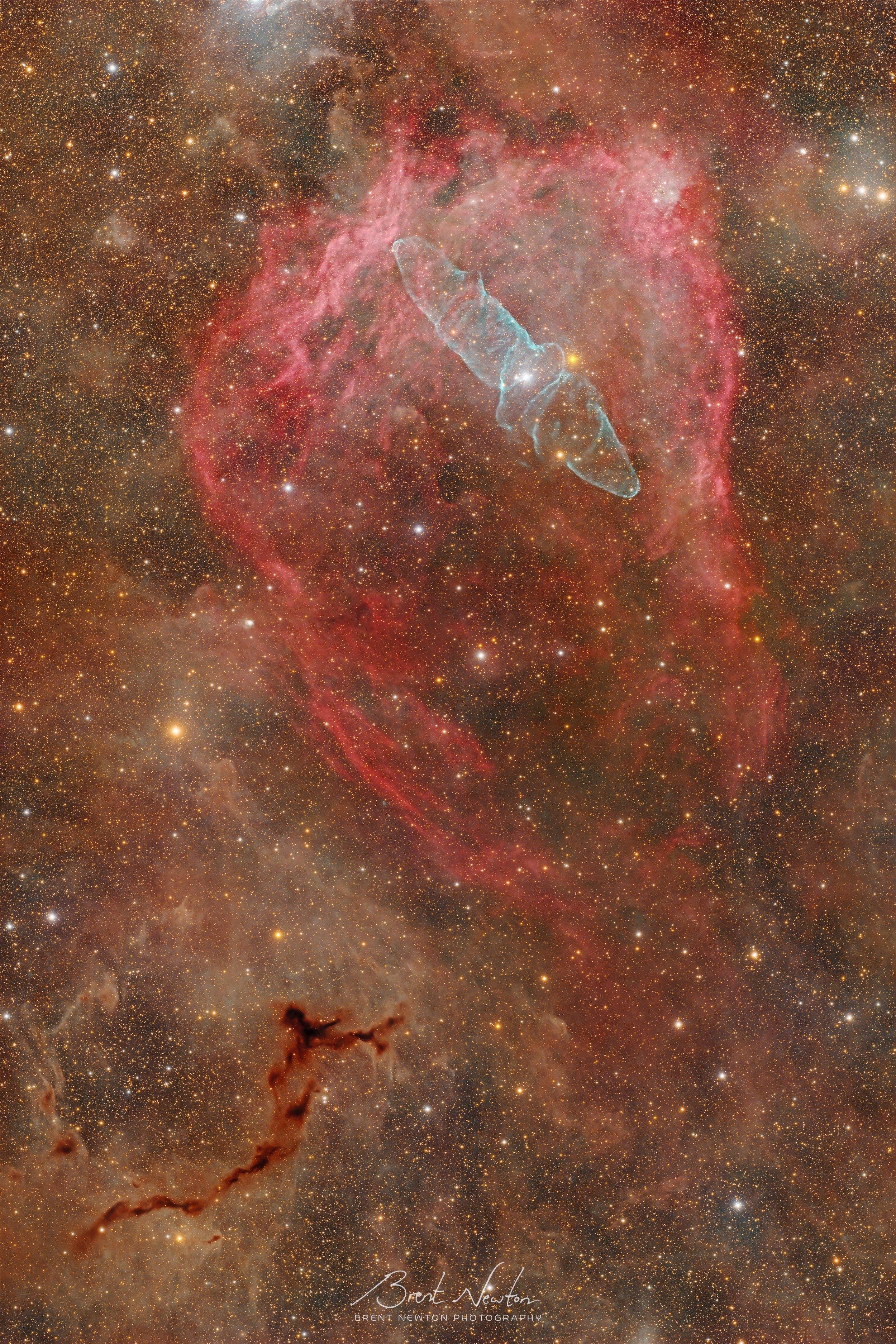Below the ionized regions, and really throughout the entire field of view, is brown/orange interstellar dust which is ubiquitous throughout the Cepheus Molecular Cloud Complex, with a thicker area of dark nebula present in the lower left blocking out visible starlight completely (Barnard 150, or the Seahorse Nebula).