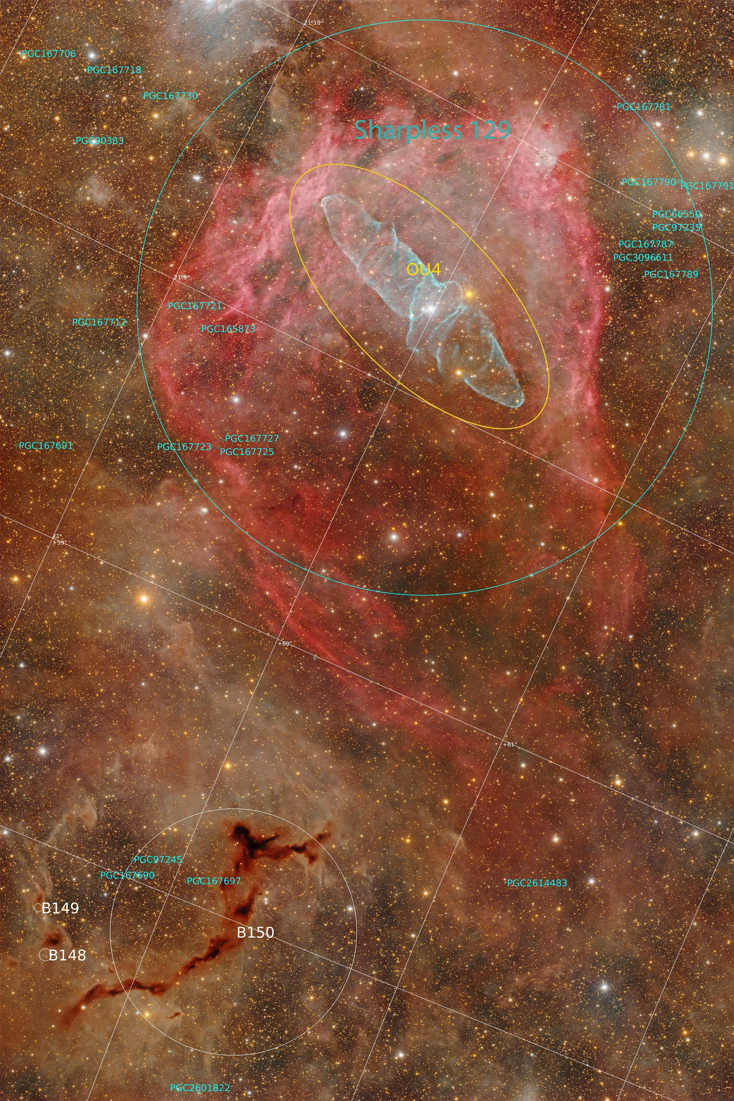 This region of sky is located in the constellation Cepheus, an area known to Astrophotographers in the Northern hemisphere for hosting a variety of expansive regions of both dark nebula and emission regions dotting the fainter upper Milky Way. This area is dominated by the twin crimson wings of Sharpless 129 (distance: approximately 1,300 lightyears), also called the Flying Bat, which is an emission region of Hydrogen ionized by O-type star HD 202214.