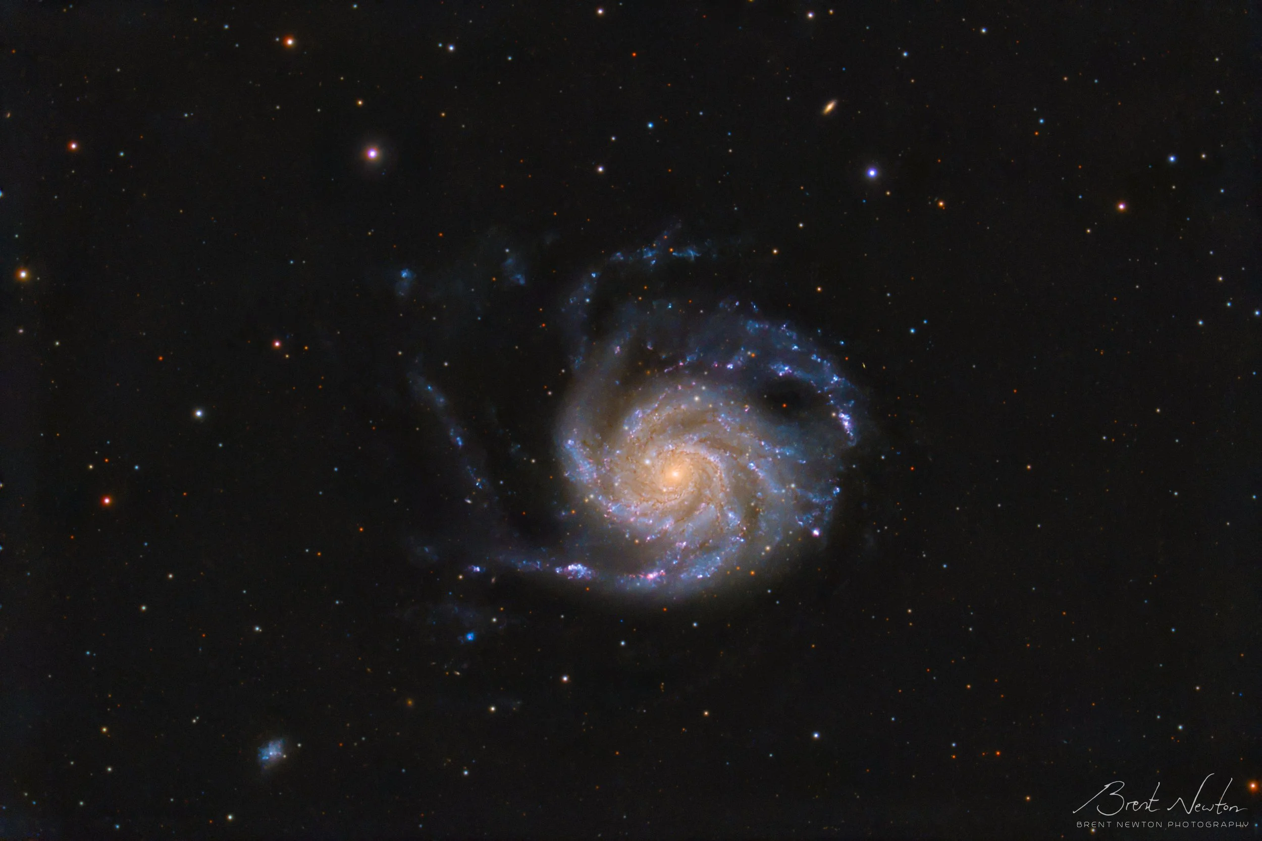 M101 is a spiral galaxy seen to our North and is best observed or photographed during the Spring. Being mostly face-on, its overall luminosity is spread over a larger apparent area (roughly the same apparent size as our Full Moon) and this can make visual observation very difficult except under dark skies or with an appreciably large telescope. In real size it is comparable to Andromeda, though this galaxy is about 21 million light years distant as opposed to Andromeda’s ~2.5.